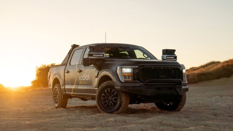Six-year-old California tech outfit Kodiak Robotics is normally focused on helping trucking companies expand their fleets with autonomous big rigs. As a side dish, Kodiak’s showing a new toy as a potential addition to the U.S. Defense Department’s expanding catalog of commercial technology. The company produces a modular self-driving suite called Kodiak Driver that it says can be adapted to any kind of vehicle. SensorPods that look like a secondary set of large side view mirrors gather information on the environment using cameras, radar, and LIDAR. The Guardian control computer applies that information to control the vehicle’s primary and redundant steering and braking systems. This is the firm’s first military prototype, “designed to provide the military with technological superiority while removing service members from high-risk reconnaissance missions.” Kodiak says building this onto a Ford F-150 took less than six months.