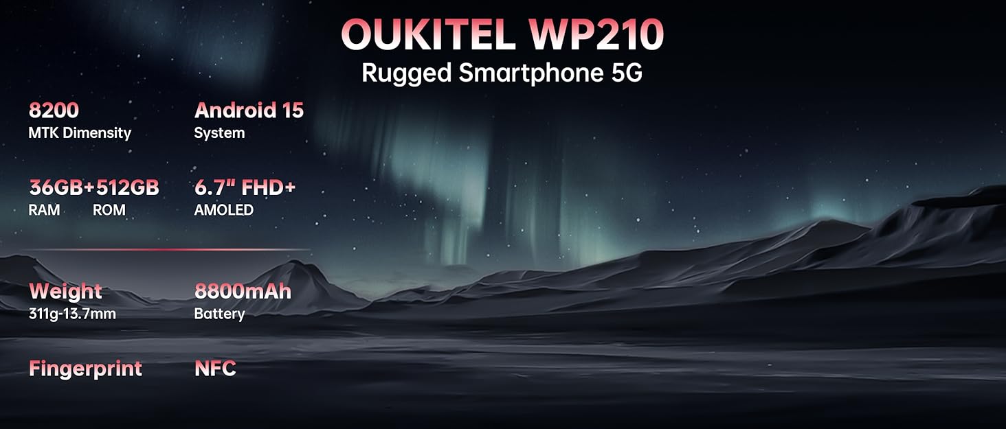 【MTK Dimensity 8200 + 6.7″ FHD+ AMOLED Display】OUKITEL WP210 rugged phone is powered by the powerful MTK Dimensity 8200 octa-core CPU (up to 3.1GHz). The OUKITEL WP210 cellphone delivers lag-free multitasking and gaming. Enjoy a 6.7″ FHD+ AMOLED display with a 120Hz refresh rate and Corning Gorilla Glass 5 protection, delivering vivid visuals whether you are reviewing plans in sunlight at a job site, streaming movies in a tent, or presenting your portfolio to clients. This Android 15 phones robust build and premium look make its equally suited for tough job sites, travel, or formal business settings